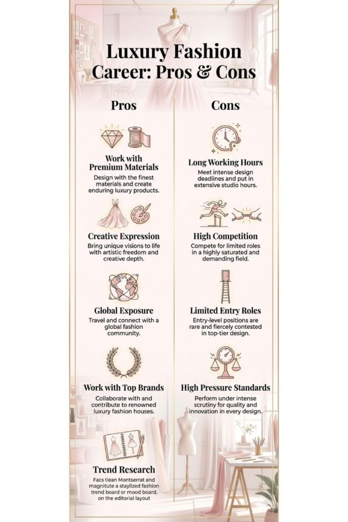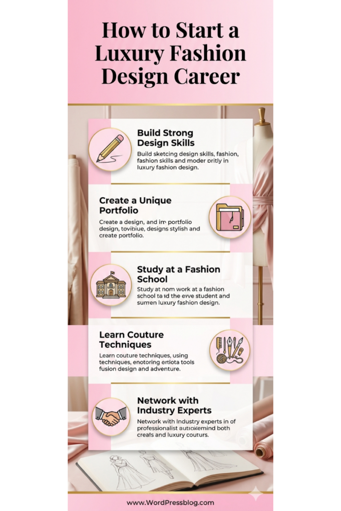 Starting a fashion design career for luxury brands is thrilling but can feel overwhelming. Many aspiring designers dream of working with names like Chanel or Gucci, yet they wonder where to begin. This guide shares practical steps, real tips, and personal-style advice to help you navigate your journey in the world of high-end fashion. What is a Fashion Design Career for Luxury Brands? A fashion design career for luxury brands means creating clothing, accessories, or collections for prestigious labels that prioritize quality, craftsmanship, and timeless style. These roles focus on combining creativity with brand heritage. In this career, you may work on couture, ready-to-wear, or capsule collections. Unlike mass-market fashion, luxury brands expect precision, deep fabric knowledge, and unique creative vision. Exploring our Luxury Fashion Beginner’s Guide helps beginners understand these industry standards How Do You Start a Fashion Design Career for Luxury Brands? This infographic highlights the key starting steps for building a successful fashion design career for luxury brands, helping beginners understand the importance of skills, portfolio development, and industry exposure. Start by building strong design skills, creating an original portfolio, studying at a reputable fashion school, and interning with established designers. Networking, understanding luxury consumers, and learning couture techniques are essential first steps. What Skills Do You Need in a Fashion Design Career for Luxury Brands? A complete overview of technical and professional skills required for a successful fashion design career for luxury brands, from sketching to communication and business understanding. Essential skills include sketching, pattern making, draping, digital design tools like Adobe Illustrator, and trend research. Soft skills such as adaptability, communication, and understanding of the fashion business also help you thrive. Why Is Portfolio Important in a Fashion Design Career for Luxury Brands? Your portfolio shows your ability to turn ideas into wearable designs, highlighting originality, technical skill, and personal style. Recruiters at luxury brands review portfolios first before interviews.Include sketches, mood boards, fabric samples, photos of garments you’ve made, and digital designs. Studying successful examples from iconic houses like Dior or Hermès can inspire your work Vogue fashion careers and improve your presentation. How Do Internships Help in a Fashion Design Career for Luxury Brands? Internships give hands-on experience, mentorship, and connections that often lead to full-time roles. Luxury brands like Louis Vuitton and Prada offer programs where interns learn the design process and brand expectations. Interns may assist with sample prep, fabric sourcing, or runway shows. This experience deepens understanding of luxury fashion operations. Many designers recommend starting with small brands to gain diverse skills before applying to top houses Business of Fashion guide What Are Real Challenges in a Fashion Design Career for Luxury Brands? Working in luxury fashion is competitive and fast-paced. Long hours to meet seasonal deadlines, precise couture standards, and balancing creativity with brand identity can be stressful. Designers must align with a brand’s heritage while expressing originality. Understanding this balance often comes from experience, mentorship, and studying brand histories, which you can explore in luxury fashion designer profiles. How Does Understanding Luxury Consumers Help in a Fashion Design Career for Luxury Brands? Luxury consumers value quality, exclusivity, and meaning in every piece. Designers who study buyer behavior can create collections that resonate and sell. For example, high-end buyers often prefer timeless elegance over fleeting trends. By understanding consumer preferences, you can design products that feel personal and valuable. Learning from luxury women’s clothing brands case studies can also provide insights into customer expectations. What Are Pros and Cons of a Fashion Design Career for Luxury Brands? Work with premium materials, collaborate with artisans, and create pieces that may be worn by celebrities or tastemakers. Cons: High competition, limited entry-level roles, long hours, and pressure to maintain brand standards, which may limit creative freedom. Overall, many designers find the rewards outweigh the challenges, especially when contributing to iconic fashion houses. A visual breakdown of the benefits and challenges of working in luxury fashion, helping aspiring designers understand real industry expectations. Real Tips for Building a Successful Fashion Design Career for Luxury Brands: Learn the Fundamentals: Study fashion illustration, pattern making, and textiles. Basics are essential for building advanced skills Luxury Fashion Beginner’s Guide. Use Digital Tools: Master Adobe Illustrator and CLO 3D to showcase professional designs. Attend Fashion Events: Network at trade fairs, exhibitions, and shows like Paris Fashion Week. Find a Mentor: Mentorship can provide guidance on brand language, workflow, and portfolio improvement. Study Brand Heritage: Learn why houses like Chanel and Dior succeeded Wikipedia luxury fashion. Fashion Design Career for Luxury Brands vs. Fast Fashion: What’s the Difference? Luxury fashion emphasizes quality, exclusivity, and artistry, spending weeks perfecting one garment. Fast fashion focuses on speed, volume, and affordability. For example, a luxury dress may be hand-stitched, whereas a fast-fashion version is machine-made for mass production. Understanding these differences helps you choose a career aligned with your values and goals. How to Get Hired by a Luxury Brand: Steps That Work Build a portfolio tailored to luxury aesthetics. Network at design events and forums. Apply for internships or assistant designer positions. Stay updated with trends, forecasts, and consumer behavior. Persi