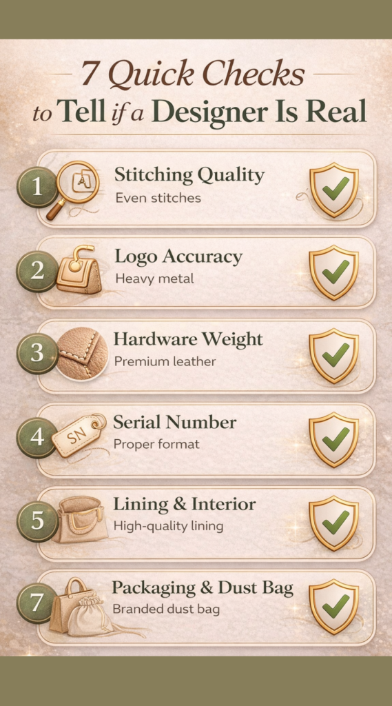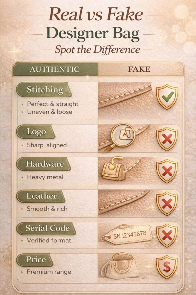 How to tell if a designer bag is real is an essential skill for any luxury shopper. With fake designer bags circulating widely, knowing the key signs of authenticity can save you time, money, and frustration. By following a few simple checks, you can confidently identify genuine bags and make smart purchases. For a detailed step-by-step guide on verifying luxury items, check out our pillar article How to Authenticate a Luxury Handbag. How Can I Tell if a Designer Bag Is Real? 7 Quick Checks to Tell if a Designer Bag is Real: Inspect stitching, logo, hardware, serial number, lining, and packaging to ensure authenticity. How to tell if a designer bag is real: a designer bag is real when its craftsmanship, materials, and markings match the brand’s official standards. Authentic bags have precise stitching, quality hardware, and correct logos. Examining the bag carefully is the first step. Check the stitching pattern, material texture, zippers, and logo placement. Each brand has unique features, so knowing what the authentic version looks like is essential. For guidance, you can follow a detailed Designer Bag Authenticity Checklist to verify each element. Once you understand authenticity, the next step is choosing wisely, this eco-friendly luxury handbags guide can help you find options that are both genuine and sustainable. What Are the Signs of a Fake Designer Handbag? “Learn to identify authentic designer bags vs fake ones with this detailed infographic covering stitching, logo, hardware, leather, serial code, and price.” How to tell if a designer bag is real helps you spot common red flags.Fake designer handbags often have uneven stitching, cheap materials, or incorrect logos. Hardware may feel light or plastic, and serial numbers could be missing or incorrect. Other red flags include mismatched colors, bad smell, or loose threads. Many counterfeit bags also have inconsistent fonts or poorly embossed brand names. Learning the general Signs of Fake Designer Handbags can help you spot suspicious items before purchase. How to Check Luxury Bag Authenticity Online? This infographic shows how to tell if a designer is real by checking photos, serial numbers, brand websites, and trusted authentication services. You can check luxury bag authenticity online using brand apps, authentication services, and trusted marketplaces. Upload clear images and details to receive professional verification. Websites like Real Authentication or Entrupy use experts and AI to confirm bag authenticity. Even high-end marketplaces such as The RealReal provide authentication before listing items. Always ensure you use reputable services to avoid mistakes. Can Authenticated Luxury Bags Be Fake? Yes, even authenticated luxury bags can sometimes be fake if the certification is forged or misrepresented. Always check certificates carefully and verify them with the issuing brand if possible. Some third-party authentication services provide detailed reports, but cross-checking with official brand resources reduces the risk of accepting a fake. For more insight, see Can Authenticated Luxury Bags Be Fake?. How Do I Spot Authentic Logos and Hardware? Authentic designer bags have logos and hardware that match the brand’s specifications perfectly. Zippers, clasps, and buttons are heavy, engraved, and aligned. Counterfeit bags often have cheap, lightweight hardware or inconsistent engraving. Compare your bag to official product photos on brand websites or high-authority fashion references like Vogue’s handbag guides to spot differences in details. What Materials Should I Look For in a Real Designer Bag? A real designer bag uses high-quality leather, suede, or branded fabrics. The texture should feel consistent, soft, and luxurious. Check linings, stitching, and edges carefully. Fake bags often use synthetic or low-grade materials that feel rough or uneven. Research the brand’s signature materials to know what is authentic. For example, Louis Vuitton uses coated canvas with precise grain patterns, while Chanel often uses quilted lambskin. How Important Are Serial Numbers and Tags? Serial numbers, holograms, or RFID tags are critical in verifying authenticity. They should match the brand’s format and be consistent with purchase documents. Fake bags may have incorrect numbers or poorly printed tags. Cross-checking with the official brand or online databases helps ensure the number is genuine. Always store receipts and certification for future reference. If you want affordable luxury, don’t miss our detailed article on “Designer Bags Under $1000″. Before purchasing, beginners can read our first time luxury handbag buyer guide to choose the perfect authentic bag. FAQs How can I quickly tell if a designer bag is fake? Check the stitching, hardware, logos, and material. Inconsistencies usually indicate a fake. Are online authentication services reliable? Yes, services like Entrupy and Real Authentication provide accurate verification when images are clear. Can a bag look real but still be fake? Yes, high-quality counterfeits may appear authentic but often have subtle flaws in serial numbers, stitching, or hardware. Should I trust certificates from resellers? Always verify certificates with the issuing brand. Third party certificates are useful but can sometimes be forged. What is the safest way to buy a designer bag? Purchase directly from official brand stores or verified luxury resale platforms with guaranteed authentication. Conclusion Knowing how to tell if a designer is real requires observation, research, and careful verification. Focus on materials, logos, hardware, stitching, and serial numbers. Use trusted online tools, check certificates, and compare with official brand references. With practice, spotting fake designer bags becomes easier, helping you make secure, confident purchases Post navigation How to Authenticate a Luxury Handbag: Complete Guide Designer Bags Under $1000:A Smart Entry Into Luxury