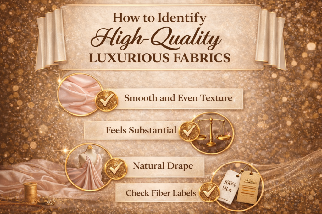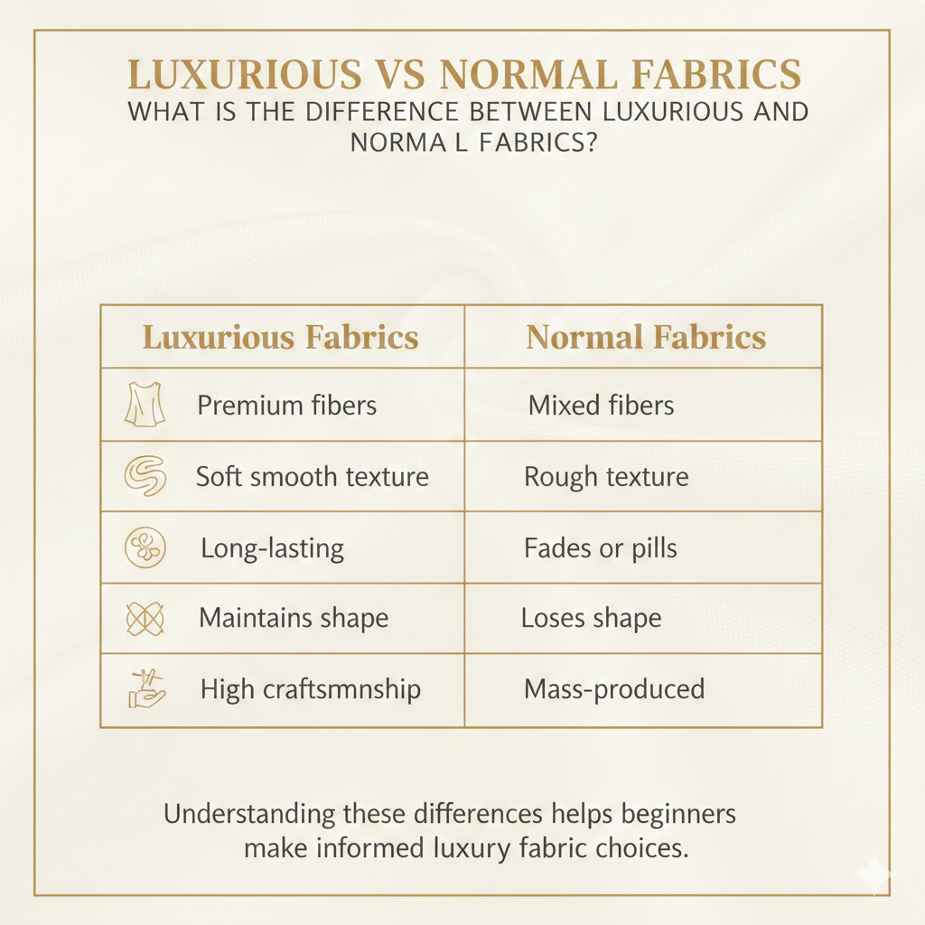 Luxurious fabrics can seem intimidating at first, but understanding the basics makes it easier to choose the perfect materials. Whether you’re shopping, designing, or just exploring, this guide introduces beginners to key fabrics, quality tips, and simple ways to identify luxurious textiles. What Are the Most Common Luxurious Fabrics? Luxurious fabrics typically include silk, cashmere, wool, satin, and high-quality cotton. These materials are valued for their texture, durability, and refined appearance.These fabrics differ from regular textiles because of their weave, fiber quality, and finishing. For example, silk has a natural sheen and smooth feel, while cashmere is incredibly soft yet strong. Knowing the most common fabrics helps beginners make informed choices and appreciate the craftsmanship behind luxurious garments. This infographic highlights some of the most common luxurious fabrics, including silk, wool, satin, and high-quality cotton, explaining why they are preferred in premium fashion. To understand timeless quality and long-term value, beginners should explore perennials luxury fabrics that remain relevant across seasons. How Can Beginners Identify High-Quality Fabrics? Beginners can check for fiber content labels, fabric weight, and weave consistency to identify quality fabrics. Touch, drape, and resilience are good indicators of authenticity.High-quality fabrics feel smooth or soft, maintain their shape, and drape naturally over the body. Observing these factors helps distinguish luxurious textiles from lower-grade alternatives. High-quality luxurious fabrics stand out through their smooth texture, balanced weight, and natural drape. By checking fiber labels and feeling the fabric’s structure, you can easily distinguish premium materials from ordinary textiles. Why Is Fabric Weight & Construction Important? Fabric weight and construction determine how a garment hangs, feels, and lasts. Heavy fabrics may offer structure, while lighter ones provide flow and comfort. Luxurious fabrics are meticulously woven to achieve the perfect balance of weight and durability. For example, a satin gown may use a dense weave to create shine and drape, while cashmere sweaters rely on precise knitting techniques. Understanding fabric weight helps beginners select items that suit their purpose and style. What Is the Difference Between Luxurious and Normal Fabrics For a luxurious fabric fashion guide for beginners, it is important to understand that luxurious fabrics are made with high-quality fibers and precise construction, while normal fabrics often focus on cost over feel and longevity, as discussed in luxury vs normal fabrics. Luxurious textiles are softer, more durable, and maintain their appearance after repeated wear. In contrast, standard fabrics may fade, pill, or lose shape quickly. Recognizing these differences allows beginners to invest wisely in long-lasting pieces that offer both comfort and elegance. How Should I Care for Luxurious Fabrics? Luxurious fabrics require careful cleaning and storage to maintain their texture and longevity. Follow care labels and handle fabrics gently. For instance, silk garments often need dry cleaning, while cashmere sweaters benefit from hand washing in cold water and flat drying. Storing fabrics in breathable garment bags and avoiding direct sunlight prevents damage and keeps materials looking fresh. Proper care ensures that luxurious textiles continue to feel and look their best over time. Which Fabrics Are Best for Seasonal Fashion? Lightweight fabrics like silk and fine cotton work well for warmer seasons, while wool, cashmere, and velvet suit colder months. Seasonal fabrics are chosen for comfort, durability, and appearance. Luxurious designers select specific weaves and finishes to ensure garments perform well under different temperatures. Beginners can start by matching fabric types to the season, which enhances both style and functionality. How Do Fabric Trends Affect Luxurious Fashion Choices? Fabric trends often influence the popularity of textures, colors, and weaves in luxurious fashion. Staying aware of trends helps beginners select pieces that are both timeless and on-trend. For example, metallic threads or jacquard patterns may become popular, but classic silk and cashmere remain enduring staples. Observing these shifts allows for smarter purchases without compromising quality. FAQs Q1: What fabric is easiest for beginners to start with? Silk and high-quality cotton are beginner-friendly, as they are versatile and easy to handle. Q2: How can I tell if cashmere is real? Real cashmere feels soft, lightweight, and warm. Check the label and try a gentle stretch test. Q3: Can luxurious fabrics be machine-washed? Most should be hand-washed or dry cleaned. Always follow care instructions. Q4: Why does fabric weight matter in fashion? Fabric weight affects drape, comfort, and suitability for seasons or occasions. Q5: Are luxurious fabrics worth the investment? Yes, because they last longer, maintain their look, and feel more comfortable than lower-quality alternatives. Conclusion & Final Thoughts Understanding luxurious fabrics is essential for beginners who want to shop, style, or design with confidence. By learning to identify quality fabrics, care for them properly, and select based on season and trends, anyone can make smart choices. Start exploring today and elevate your wardrobe with pieces that feel as luxurious as they look! Post navigation Luxury Fashion Beginners Guide USA 2026 :A Smart Start for Beggingers Luxury vs Normal Fabrics: A Simple, Honest Comparison