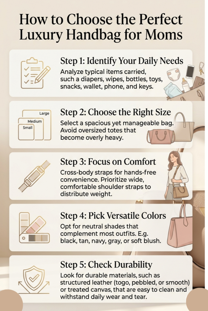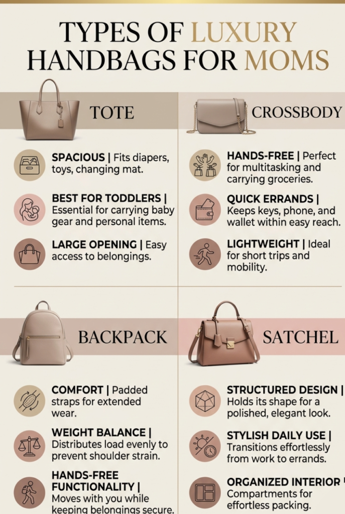 Discover the best luxury handbags for moms that blend style and practicality. Smart tips, real examples, and trusted picks for everyday life. Luxury Handbags for Moms are not just about fashion ,they are about balance. As a mom, you need something stylish but also practical enough for daily life. I’ve seen many moms struggle between carrying a chic designer bag and a functional diaper-style tote. Luxury Handbags for Moms today are designed with real life in mind. From school runs to quick grocery stops and even dinner outings, the right bag can support your lifestyle without sacrificing elegance. If you’ve ever tried fitting snacks, wipes, your phone, and still wanted to look put together—you’re not alone. Let’s break down what actually works. Why Are Luxury Handbags for Moms Worth It? Luxury Handbags for Moms are worth it because they combine durability, thoughtful design, and timeless style. Unlike cheaper bags, they are built to handle daily wear while still looking elegant, making them a long-term investment. Many moms I know started with budget bags but ended up replacing them often. A well-made luxury bag can last years, even with heavy use. Materials like genuine leather age beautifully instead of wearing out quickly. Also, luxury brands focus on details strong stitching, smart compartments, and comfortable straps. These small things make a big difference when you’re carrying your bag all day. What Features Should Moms Look for in Luxury Handbags? The best Luxury Handbags for Moms include spacious interiors, multiple compartments, durable materials, and comfortable straps. These features help manage daily essentials while keeping everything organized and easy to access. When choosing luxury handbags for moms, features like space, durability, and comfort matter the most. This quick guide helps you pick a bag that supports your daily routine without compromising style. Think about your daily routine. Do you carry snacks, toys, or extra clothes? A bag with sections helps avoid that messy “digging for keys” moment. Zip closures are also helpful, especially when you’re moving around a lot. Crossbody or shoulder straps are another lifesaver. I’ve seen moms switch from hand-carry bags to crossbody styles just for convenience it frees your hands when managing kids. Are Luxury Handbags for Moms Practical for Daily Use? Luxury Handbags for Moms can be practical for daily use if you choose designs made for functionality, such as totes, satchels, or crossbody bags with enough space and durability for everyday essentials. In real life, practicality means quick access and comfort. A structured tote can hold everything, but a crossbody is better when you’re constantly on the move. Some moms even keep two bags, one large for daytime and one smaller for quick outings. For example, a mom going to a school pickup might prefer a lightweight crossbody, while a day out with toddlers may require a larger tote. Best Types of Luxury Handbags for Moms Luxury Handbags for Moms come in several styles, but the most useful ones include totes, crossbody bags, backpacks, and satchels. Each type fits different routines and needs. Not every bag works the same for every mom. This comparison of luxury handbags for moms helps you understand which style fits your daily routine best. Tote bags are perfect for carrying more items great for moms with younger kids. Crossbody bags are ideal for quick errands. Backpack-style luxury bags are becoming popular because they distribute weight evenly. Satchels sit somewhere in between structured, stylish, and practical for everyday use. Choosing the right type depends on your lifestyle, not just trends. If you’re just starting your collection, you might find this helpful: Best Luxury Handbags for First-Time Buyers How to Balance Style and Function in Luxury Handbags for Moms? Luxury Handbags for Moms should feel like an extension of your personal style while still meeting your daily needs. The key is choosing neutral colors, versatile shapes, and designs that work across multiple occasions. A black, beige, or tan bag can go with almost everything. I’ve noticed moms who pick neutral tones use their bags more often because they match both casual and dressy outfits. Avoid overly delicate designs if you’re always on the go. Instead, look for structured bags that hold their shape and resist wear.If you’re concerned about authenticity while investing, check this guide: How to authenticate luxury handbags Are Designer Bags Better Than Affordable Alternatives? Se Designer bags are generally more durable and thoughtfully designed than affordable alternatives, but they are only worth it if they fit your daily lifestyle and needs as a mom. Affordable bags can look great initially, but many lose shape or wear out quickly. On the other hand, designer bags often maintain structure and quality over time. However, not every mom needs a high-end bag. If your routine is rough on bags , like constant spills or outdoor activities, you might prefer mid-range options. You can explore budget-friendly options here: Designer Bags Under $1000 How to Choose the Right Luxury Handbag for Your Lifestyle? Choosing the right Luxury Handbags for Moms depends on your daily routine, number of kids, and personal preferences. A bag that works for one mom may not work for another. If you’re always traveling, go for lightweight and secure designs. If you attend events or meetings, a structured satchel may suit you better. Choosing the right luxury handbags for moms becomes easier when you focus on your lifestyle needs. This step-by-step guide helps you make a practical and stylish choice. I’ve seen moms regret buying trendy bags that don’t fit their lifestyle. Before buying, ask yourself: “Will I actually use this every day?” Also, consider sustainable options if you care about long-term impact. Real-Life Tips Moms Swear By From real conversations and observations, here are some