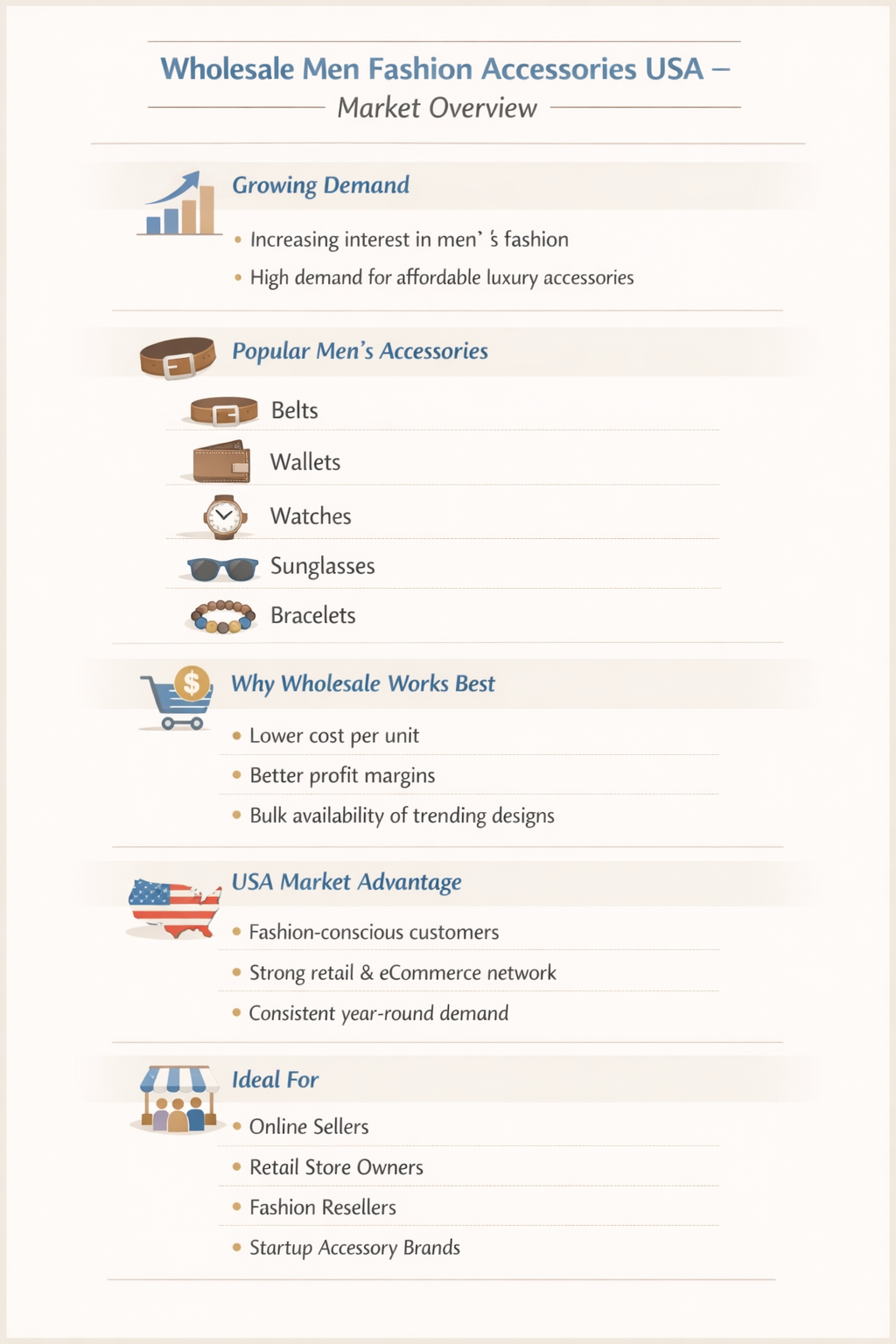 The men’s fashion market in the USA is growing faster than ever. From everyday basics to luxury-inspired pieces, men’s fashion accessories are now essential for modern style. For retailers, boutique owners, and online sellers, buying wholesale men’s fashion accessories in the USA is one of the smartest ways to build profit with low risk. This guide is written for real people and real businesses. No theory, no hype only practical advice you can actually use. Overview of the USA wholesale men’s fashion accessories market, including top accessories, market trends, and ideal buyers. Why Men’s Fashion Accessories Are a Profitable Wholesale Business Men today care about style, identity, and convenience. Accessories allow them to upgrade their look without buying full outfits. High Demand, Low Returns Accessories like belts, wallets, sunglasses, and watches: Have steady demand all year Are easy to size (low return rates) Work well for both online and offline stores According to fashion industry insights on Accessories are one of the most consistent segments in fashion retail. What Counts as Men’s Fashion Accessories in Wholesale When sourcing wholesale men’s fashion accessories in the USA, focus on categories that sell repeatedly. Core Wholesale Categories Belts (leather, vegan, designer-inspired)Wallets & card holders Watches (fashion & lifestyle) Sunglasses & eyewearBracelets, chains & ringsCaps, hats & scarves Tie sets & cufflinks You can also cross-sell with related niches like Luxury shoes Luxury Lifestyle Wholesale vs Retail – Why Wholesale Wins Better Margins Buying wholesale allows: Lower cost per unit Higher markup (40–70% common) Faster Inventory Turnover Bundle deals and volume disco Accessories don’t expire and don’t go out of trend quickly, making them safer than apparel. For business insights on scaling retail profit How to Choose the Right Wholesale Supplier in the USA Not all suppliers are equal. Choosing the wrong one can damage your brand. What to Look For Clear product photos Consistent quality Reasonable MOQs (minimum order quantities) USA-based shipping or fast logistics Transparent pricing Avoid suppliers with: No return policy No reviews or digital presence Extremely low prices (often poor quality) Trending Wholesale Men’s Fashion Accessories in the USA (2025) in What’s Selling Right Now Minimalist watches Sustainable materials Matte-finish sunglasses Leather-look vegan accessories Neutral-tone belts and wallets You can explore sustainability trends alongside Sustainable Luxury Handbags Pricing Strategy for Wholesale Men’s Accessories Pricing is emotional. Men buy accessories when they feel the value. Smart Pricing Formula Wholesale Cost × 2.5 = Safe Retail Price Example: Wholesale wallet: $8 Retail price: $20–25 For premium positioning, bundle accessories with: Luxury Jewellery for women Affordable Luxury Jewellery Online vs Physical Stores ,Where Wholesale Works Best Online Stores Perfect for: Dropshipping Instagram & Facebook selling Marketplaces Accessories pair well with niche content like Best Fashion Advice Websites Physical Stores Great for: Impulse buying Gift shoppers Seasonal promotions Branding Matters More Than You Think Even wholesale products can feel premium with the right branding. Small Branding Tweaks Clean packaging Neutral colors Simple logo cards Style-focused product names You can learn brand structuring from Tech pack in fashion Common Mistakes to Avoid in Wholesale Men’s Accessories ❌ Buying too many styles at once ❌ Ignoring customer feedback ❌ Competing only on price ❌ No product descriptions or storytelling Instead, focus on trust and consistency. Cross-Niche Selling Opportunities Men’s accessories perform even better when connected with other fashion niches: Luxury Women’s Clothing Brands British Luxury Fashion Brands Blind Sunglasses This builds internal SEO strength and increases order value. FAQs – Wholesale Men’s Fashion Accessories in the USA What are wholesale men’s fashion accessories? Wholesale men’s fashion accessories are products like belts, wallets, watches, and sunglasses sold in bulk at lower prices for resale. Is wholesale men’s fashion accessories business profitable in the USA? Accessories have low return rates, strong demand, and good margins, making them highly profitable. How do I start selling wholesale men’s fashion accessories? Start by choosing a niche, finding a reliable supplier, setting pricing, and selling through online or physical channels. What accessories sell best in wholesale? Belts, wallets, sunglasses, and watches are top-selling wholesale men’s accessories in the USA. Can I sell wholesale men’s fashion accessories online? Absolutely. Online platforms and social media are ideal for selling accessories with minimal investment. Final Thoughts Wholesale men’s fashion accessories in the USA are not just a trend. they are a long-term business opportunity. With the right products, smart pricing, and simple branding, you can build a profitable and sustainable fashion business.Start small, stay consistent, and grow with confidence. Fashion rewards patience and accessories reward smart sellers. Post navigation Best Entry Level Luxury Watch: A Smart and Authentic Beginner’s Guide Casual Elegance Clothing: The Ultimate Guide to Effortless Style & Comfort